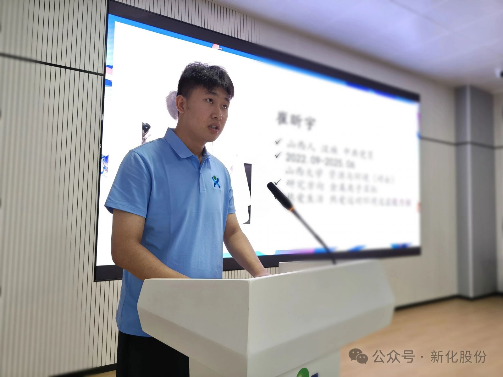 授旗仪式后,“薪火相传”环节接续登场,成为传承新化匠心的生动载体。师傅代表、公司资深业务骨干朱得林同志结合自身在新化19 年的成长历程,分享了从职场新人到“技术能手”的奋斗故事。“薪火不是简单的技能传递,而是‘把事情做到极致’的信念接力。”她笑着对新员工说,“期待你们接过这根‘接力棒’,在岗位上打磨真本领,让青春在实干中闪光。”